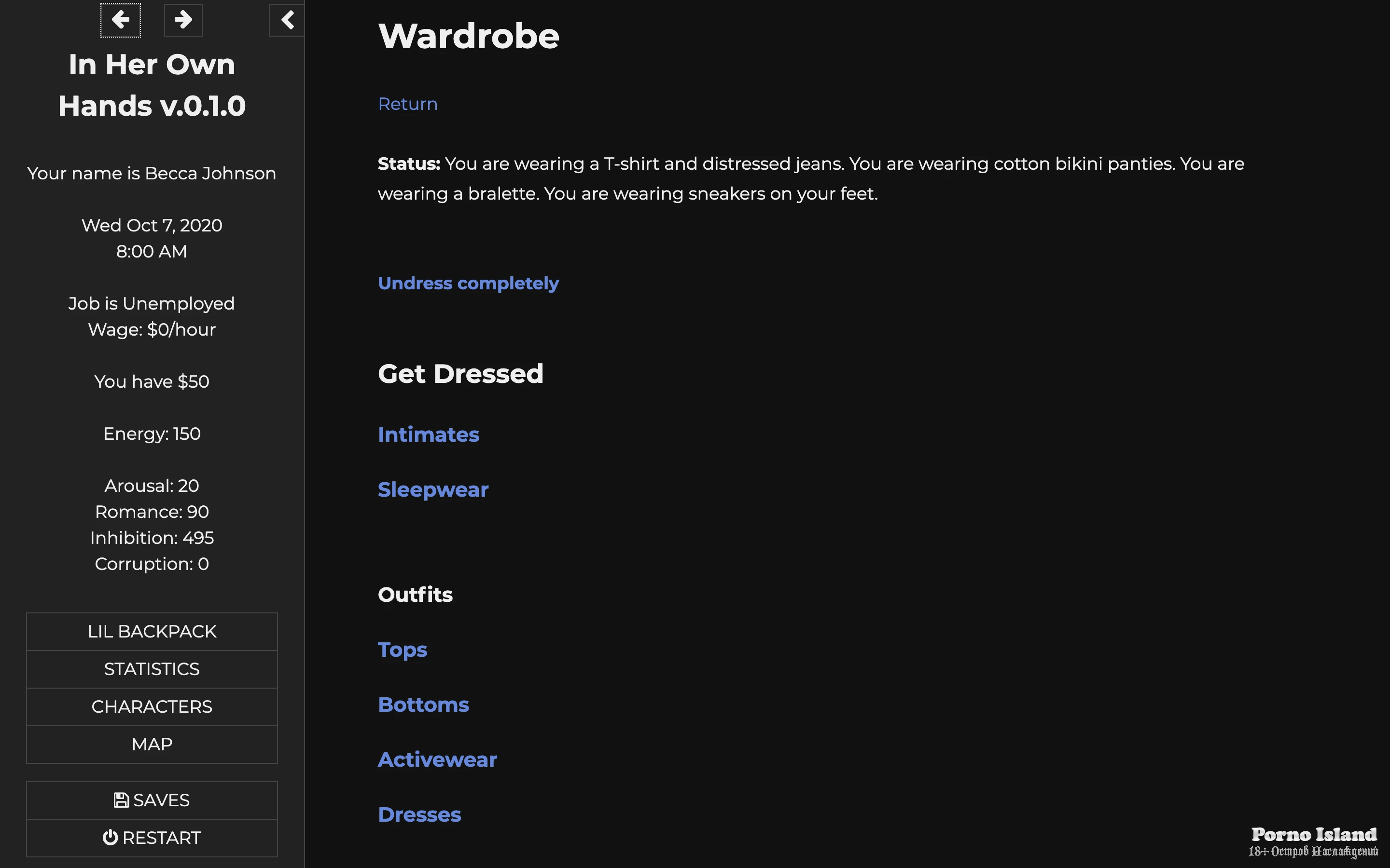 Wardrobe items defined with statistics measuring Comfy, Naughty, and Professional; these statistics affect Inhibition/Corruption stats; designed to affect future scenes