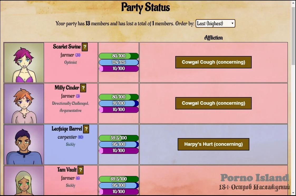 - Party members who leave the party due to low health, low morale, or high lust can now get one of multiple unique fate epilogues.