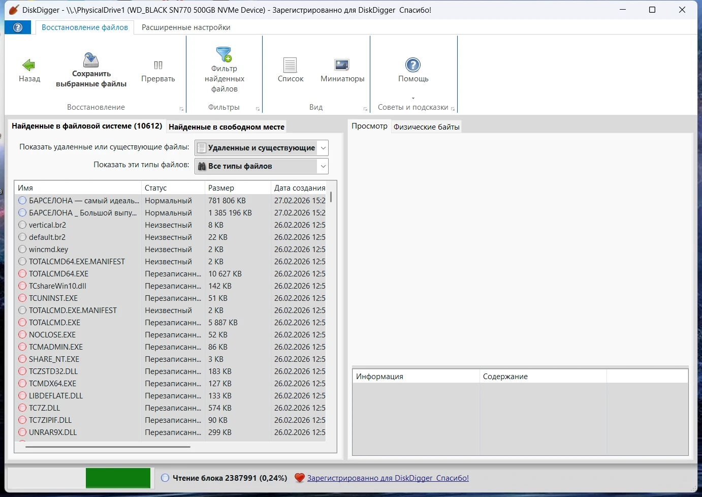 • Просмотр восстанавливаемых файлов в виде списка или в виде эскизов.
