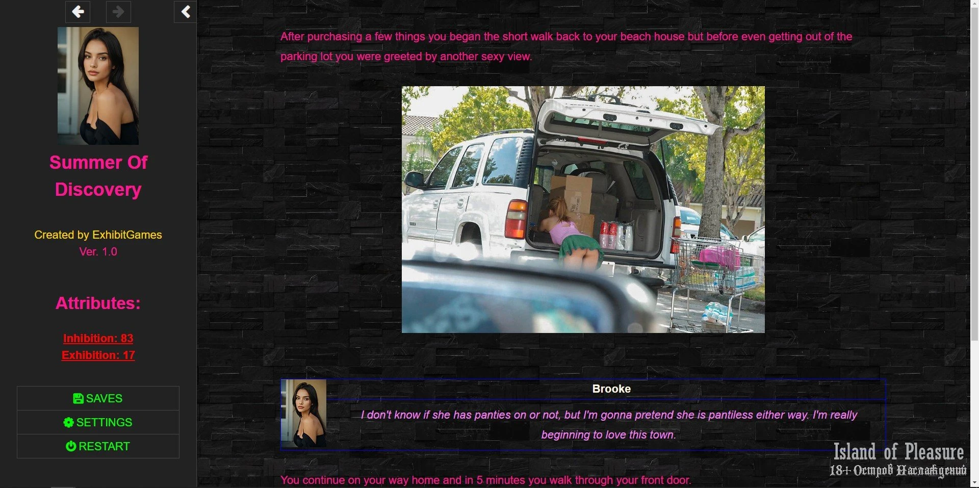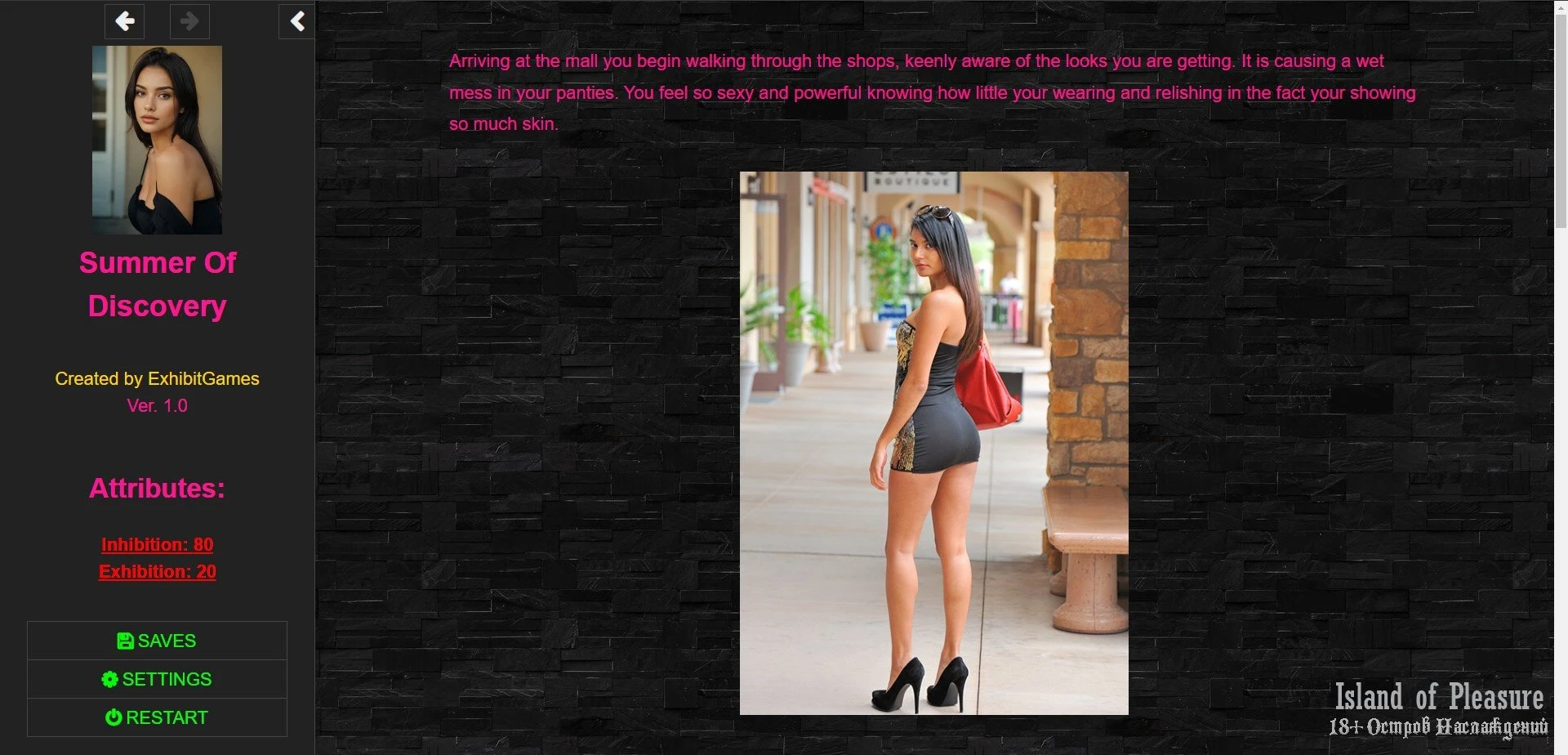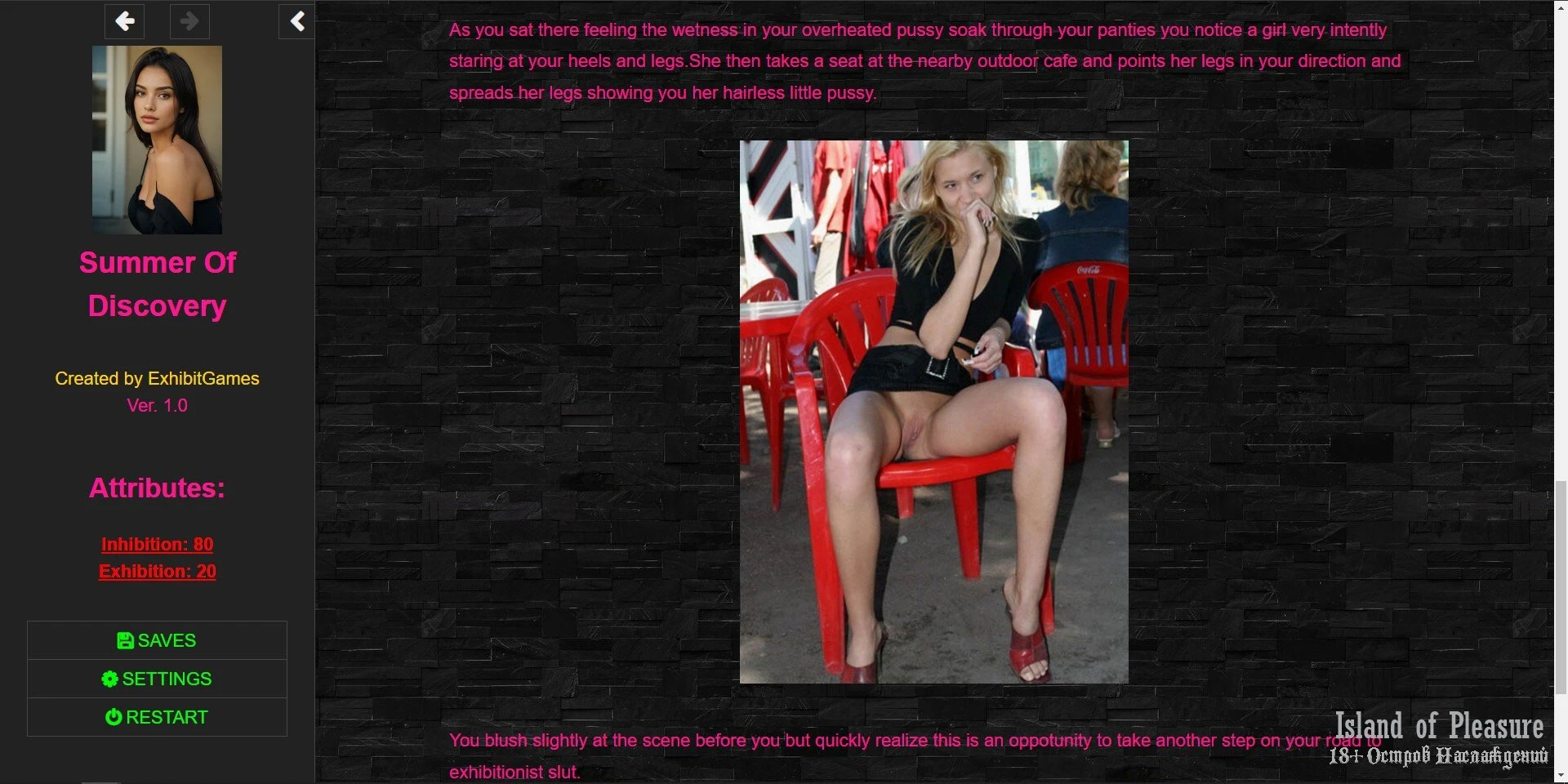Жанр: cheating, corruption, exhibitionism, female protagonist, lesbian, masturbation, multiple endings, oral, real porn, sex toys, teasing, text based, vaginal, voyeurism,