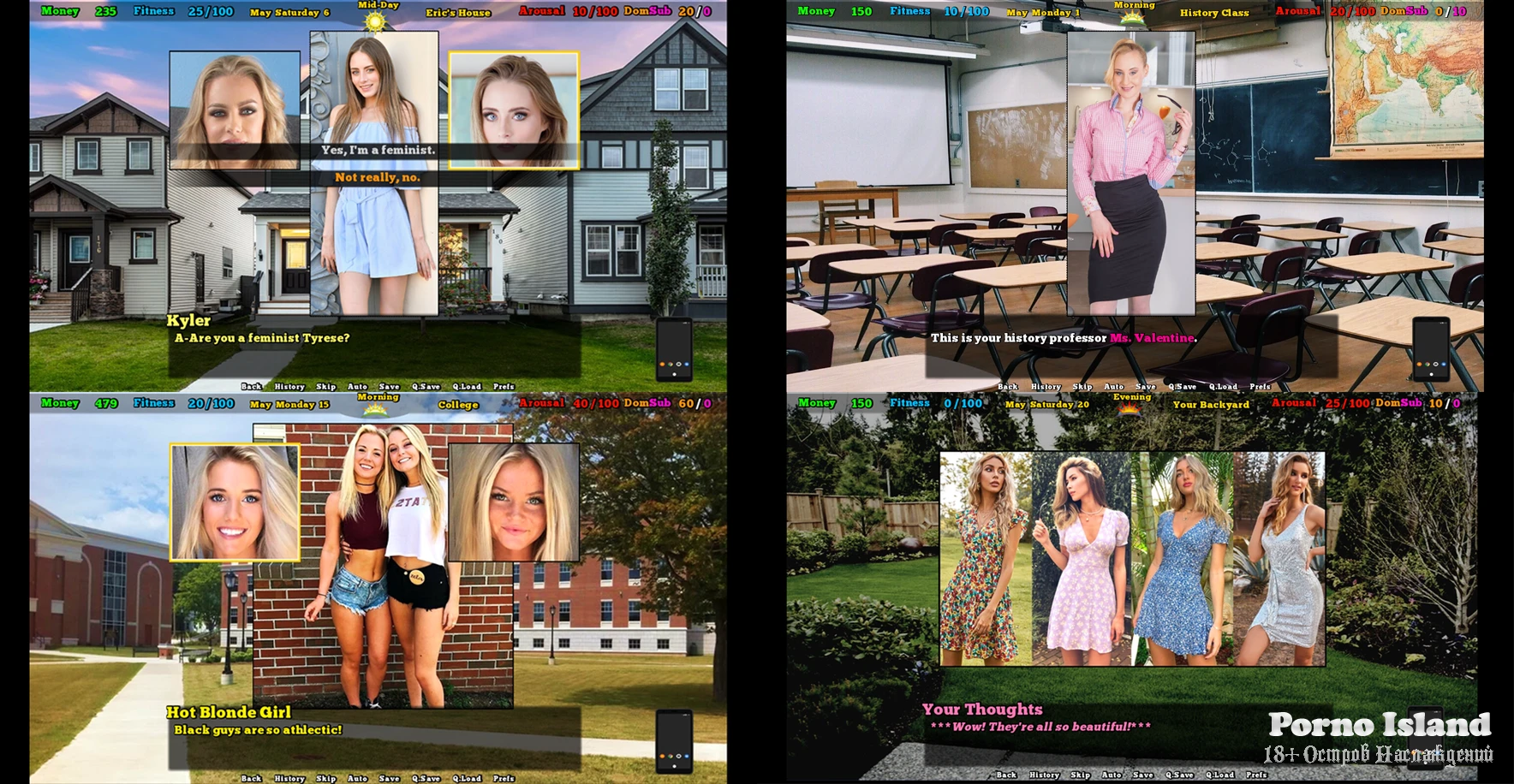 Class scenes: 1 Apology scene in front of class. 2 Basement lesson with Ms.Valentine. She rebukes you for sexism. 3 Basement lesson with Ms.Valentine. She questions you about your insecurity. 4 Basement lesson with Ms.Valentine. She questions you about interracial relationships. 5 Basement lesson with MS.Valentine. She tries to convince you to be more feminine. 6 Dream about Ms.Valentine giving a black man oral sex. 7 Lecture hall with Ms.Valentine. She lectures about how white men control white women. 8 Lecture hall with Ms.Valentine. She lectures how black men are better than white males. 9 Lecture hall with Ms.Valentine. She convinces her students to be more slutty. 10 Lecture hall with Ms.Valentine. She lectures about how race mixing is good. 11 Lecture hall with Ms.Valentine. She explains why she uses the phrase 'white males' and humiliates you in front of the class. Friend Scenes: 1 Friends house, see your friends porn collection accidentally. 2 Friends house, see a porn video playing on your friend's laptop. 3 Friends house, see porn on friend’s laptop computer. 4 Friends house, friend shows you a porn video. New Girlfriend Scenes: 1 Rub Jia’s pussy. 2 Premature ejaculation in your pants. 3 Jia jerks you off. v0.3c