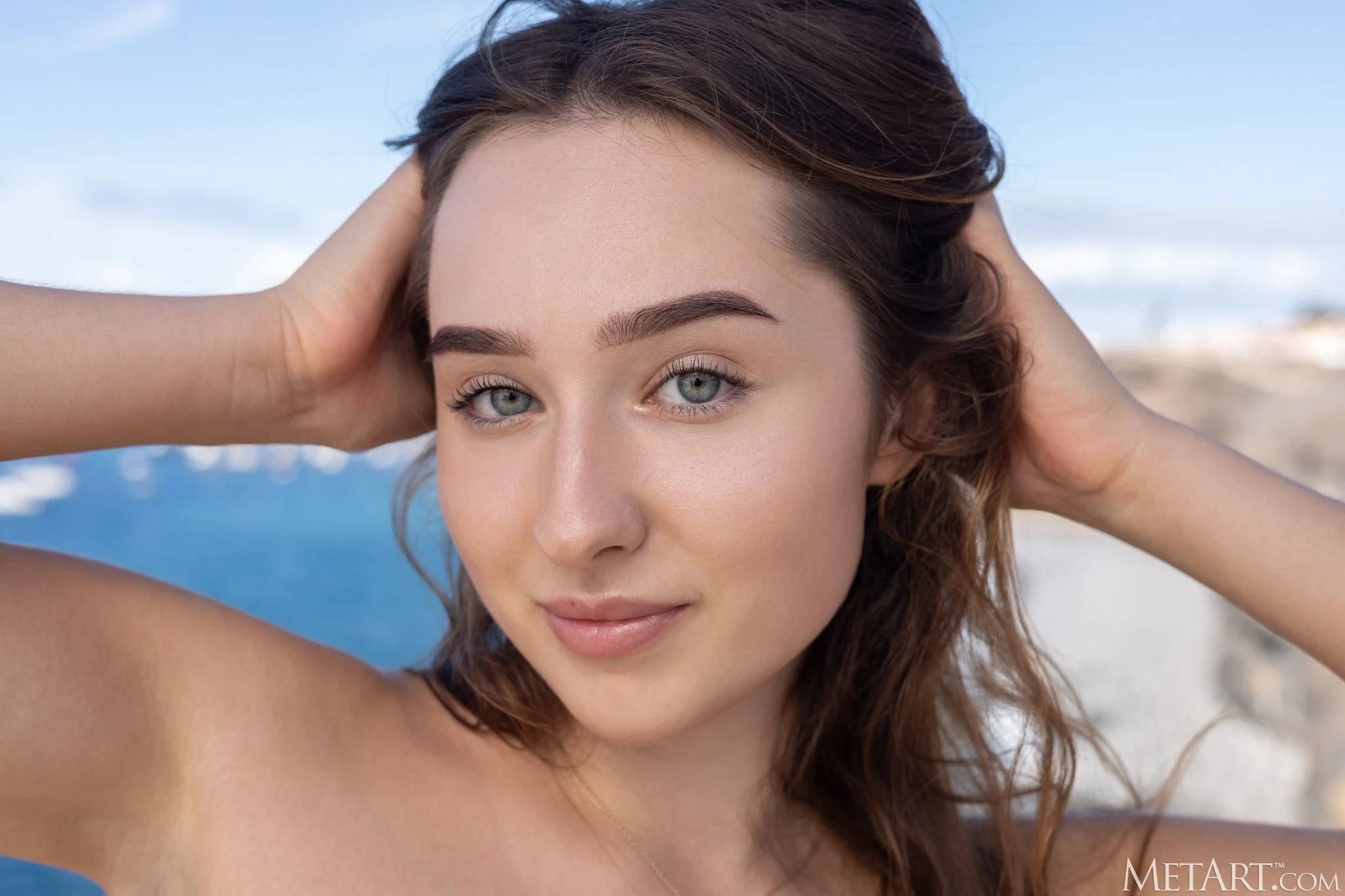 Модель: BozhenaРешительно распахнув на себе платье на берегу моря и шокируя своим действиями окружающих, голая девушка с шикарным телом хвастается перед камерой своей сочной упругой грудью и попкой и, возбуждающе поворачиваясь к нам в разных позах, крупным планом показывает между ног пухлую нежную киску.