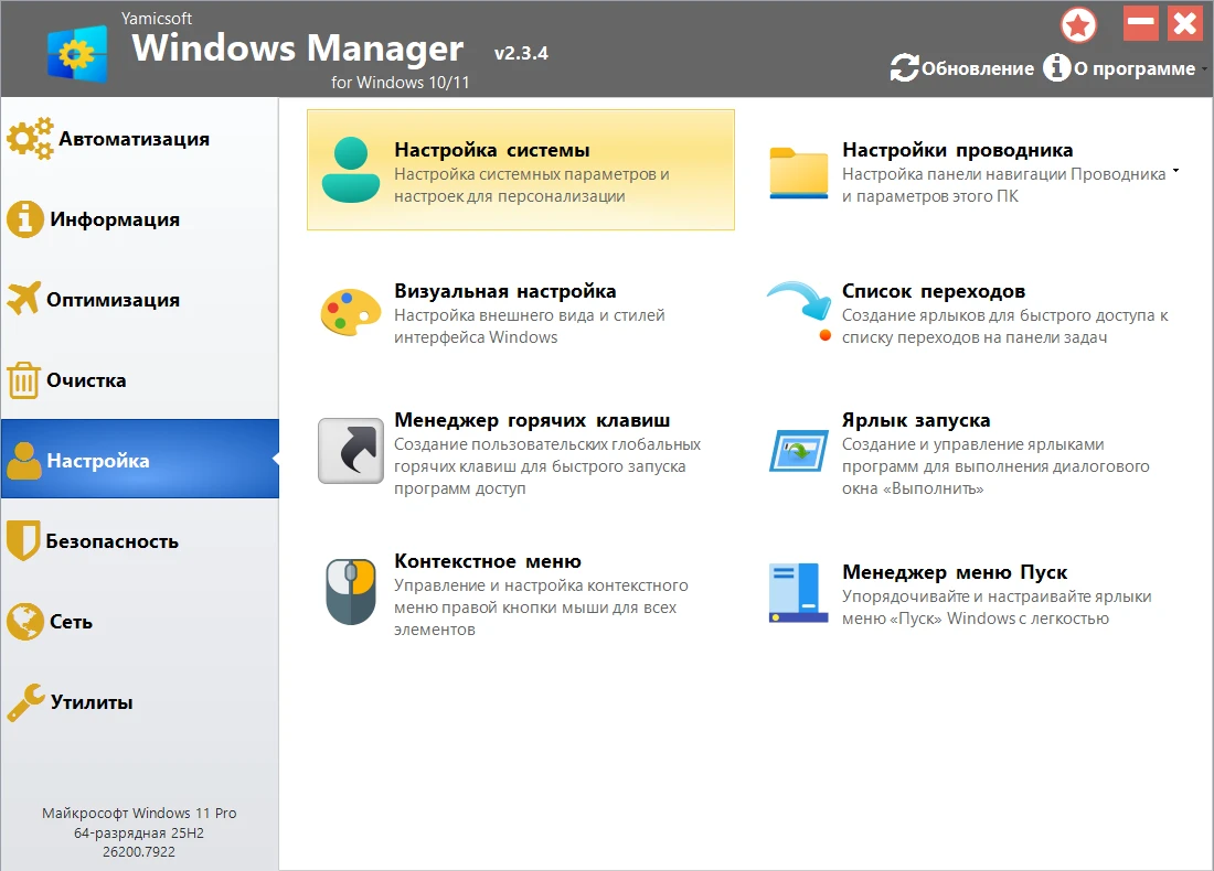 Windows Manager - это универсальная утилита для Microsoft Windows 10/11, включающая в себя более сорока различных утилит для оптимизации, настройки, очистки, ускорения и ремонта Windows 10/11, помогающая ускорить работу системы, устранить системные ошибки, повысить стабильность и безопасность, персонализировать вашу копию Windows 10/11 и оправдать все ваши ожидания.