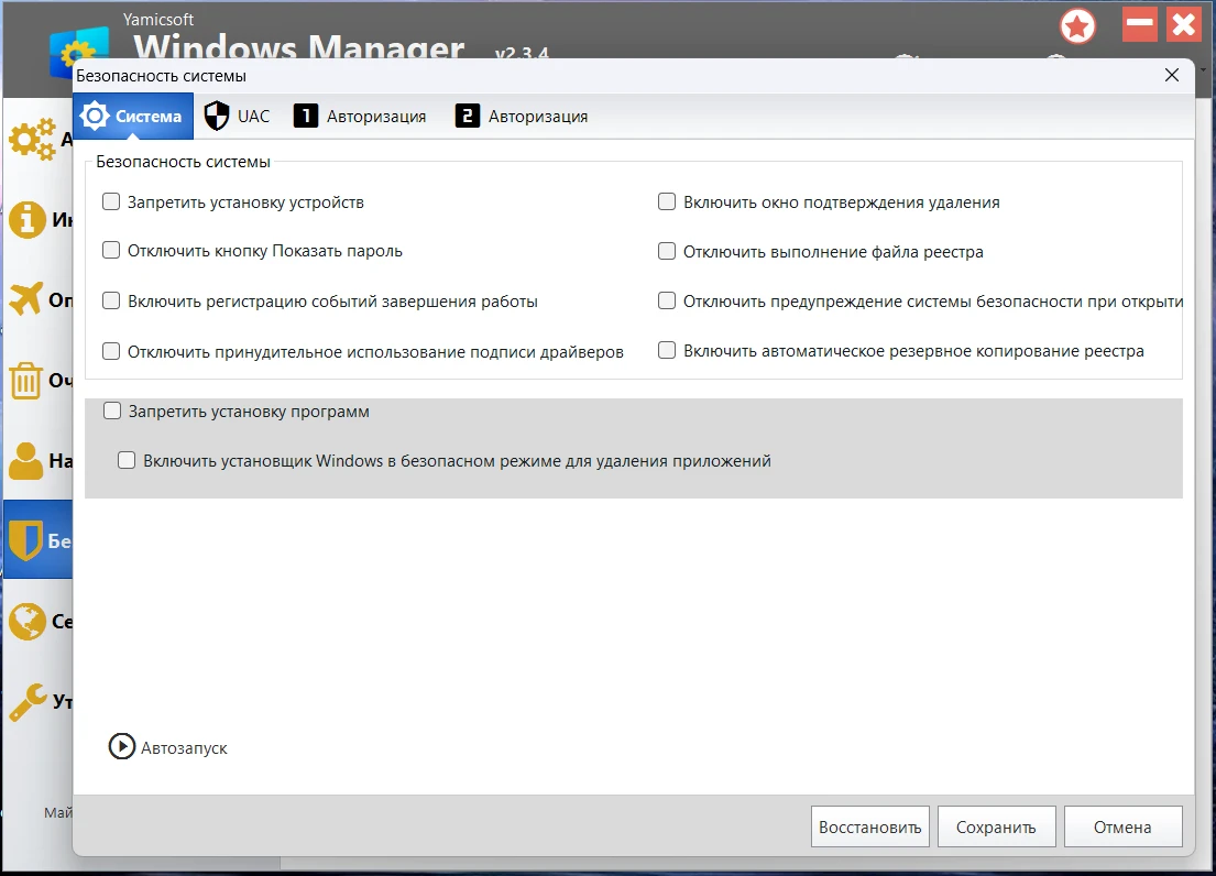 Настраивает параметры системы, компонентов, UAC, входа в систему, регулирует различные параметры и ограничивает доступ к дискам и программам для повышения безопасности системы; обеспечивает безопасность конфиденциальных файлов и папок, шифрует файлы, перемещает системные папки в безопасные места; Privacy Protector обеспечивает конфиденциальность и сохранность конфиденциальной информации, устраняя следы; File Undelete восстанавливает и восстанавливает удаленные или отформатированные файлы на логических дисках; блокирует некоторые системные функции для повышения безопасности.
