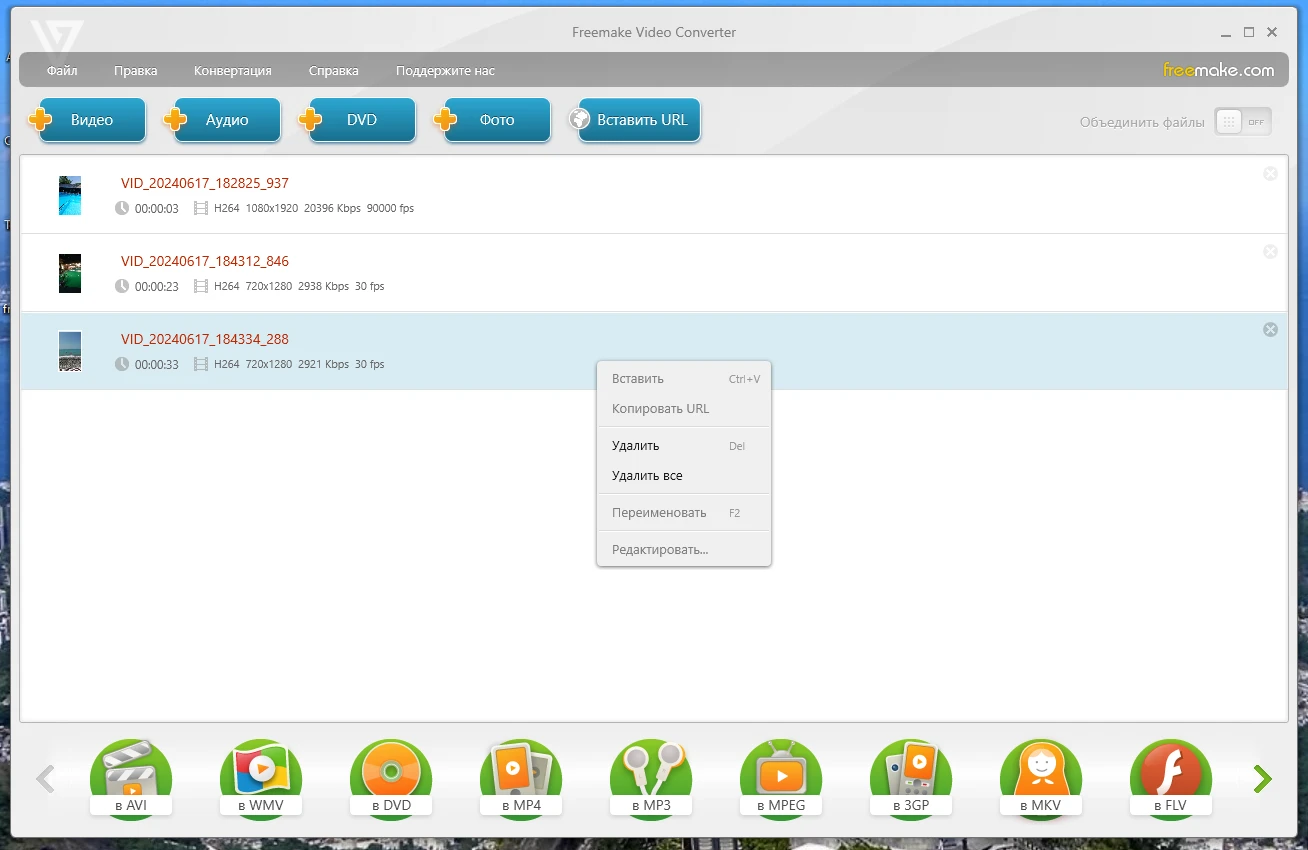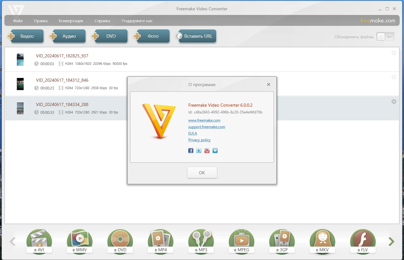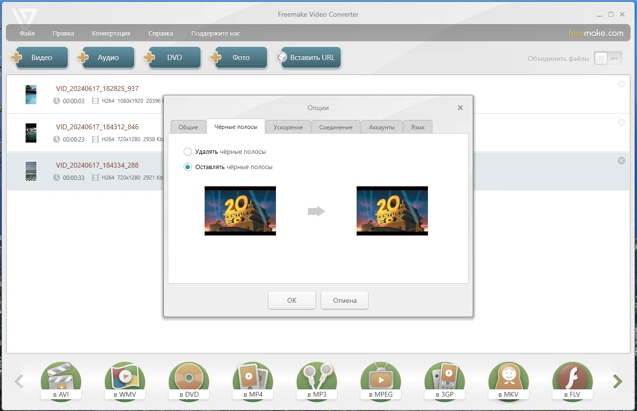 поддержка исходящих форматов AVI, WMV, MP4, MKV, FLV, SWF, 3GP, MP3