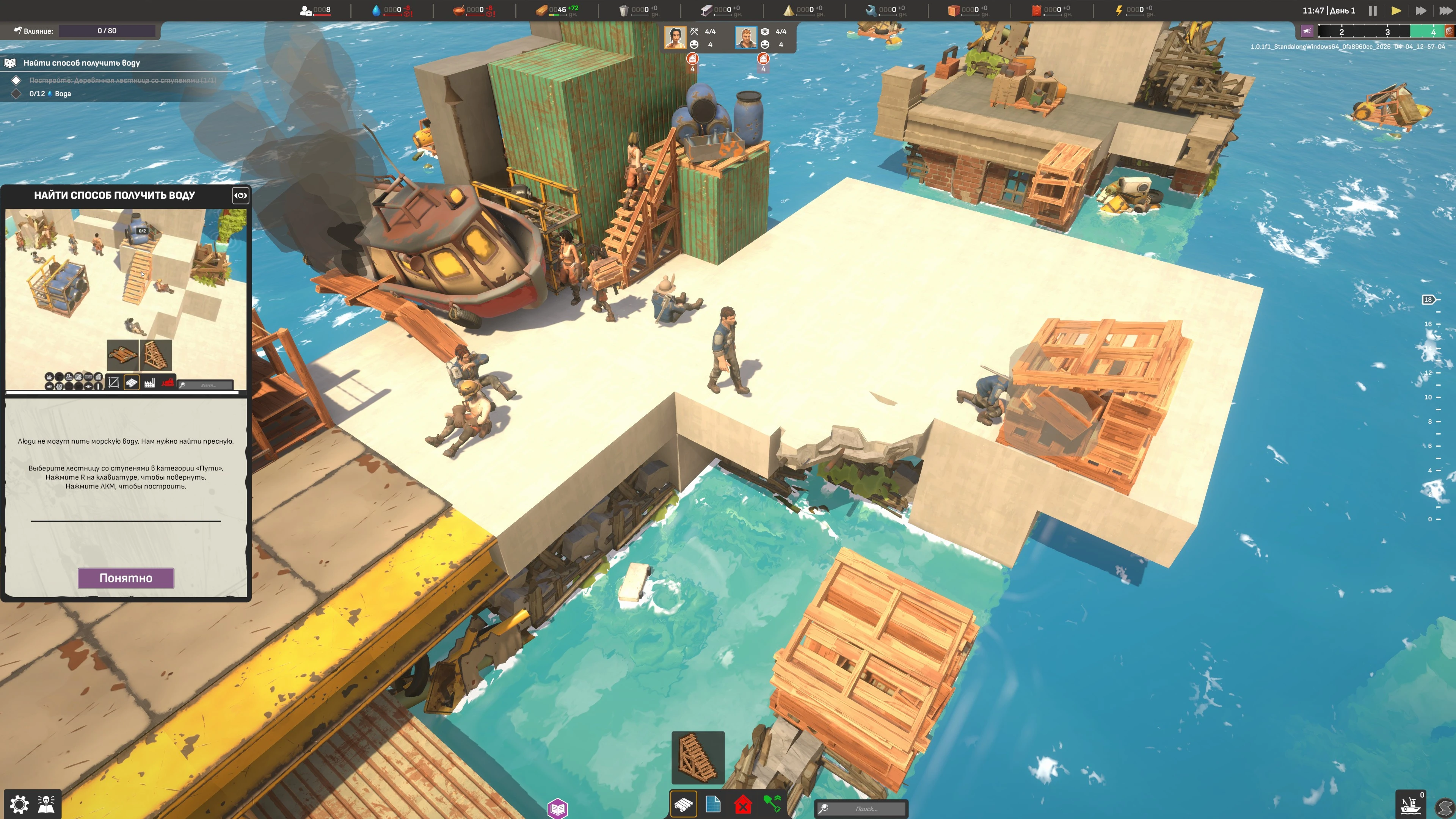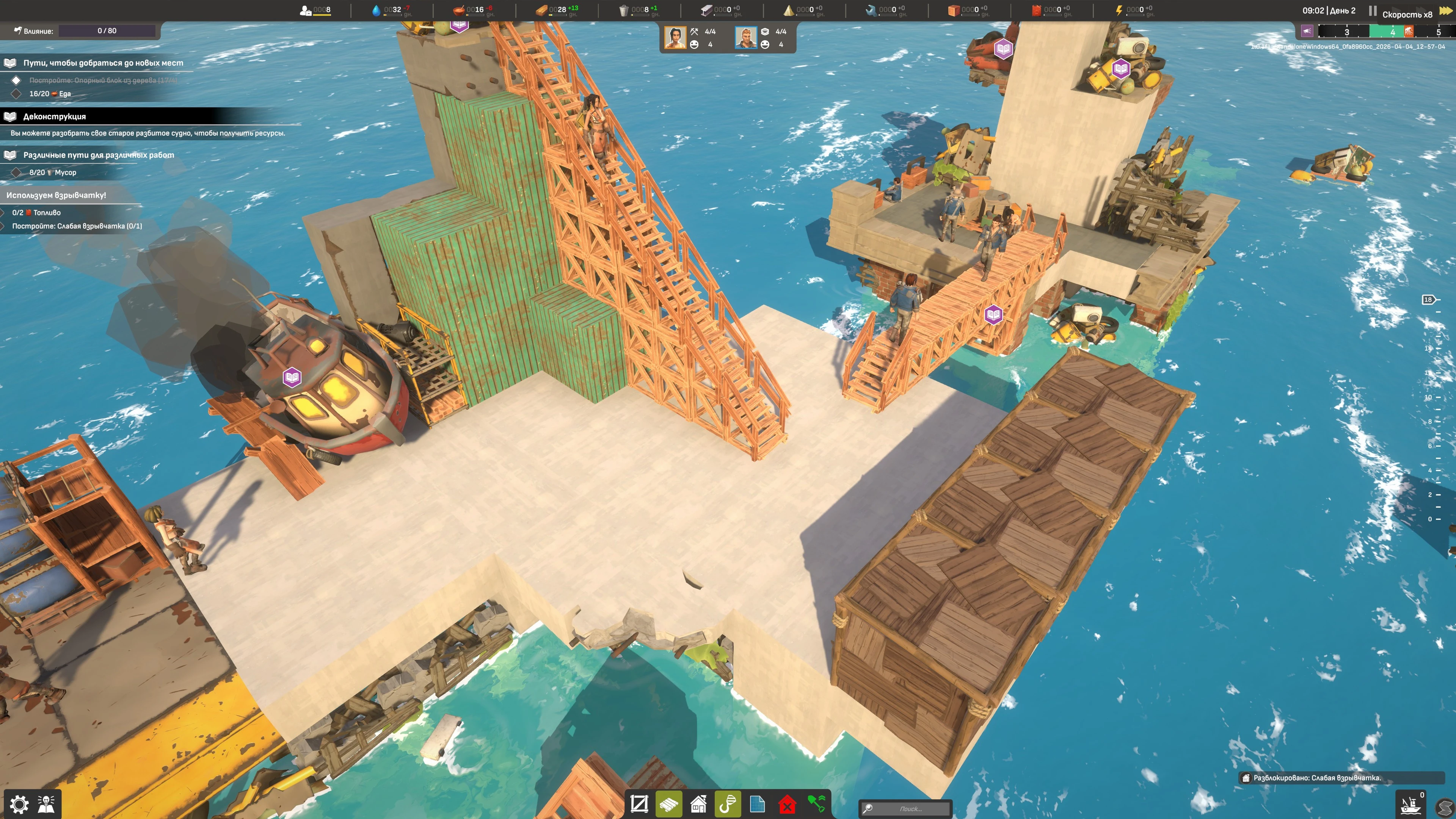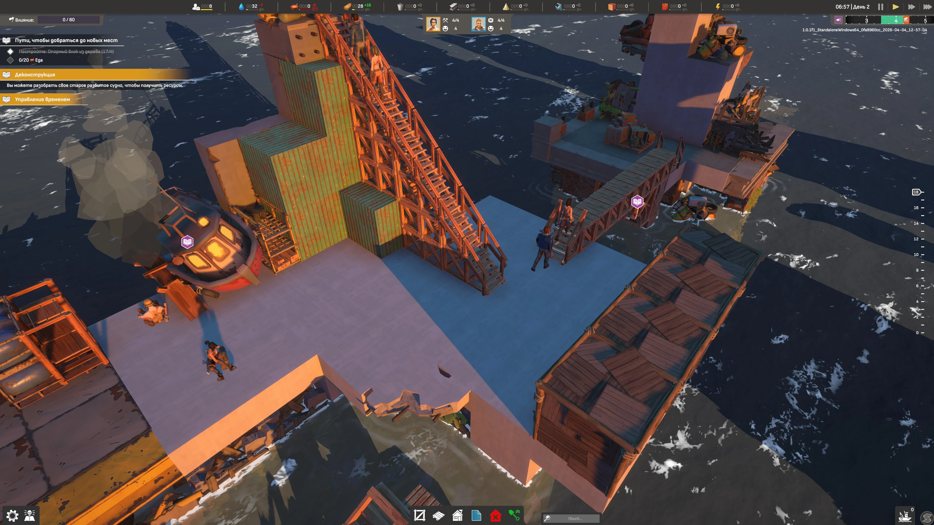 Отправляйте выживших в затопленный мир на поиски ресурсов и новых строительных площадок. Отступающие приливы открывают новые территории и ресурсы, до которых можно добраться с помощью техники, лестниц, взрывчатки и других средств.