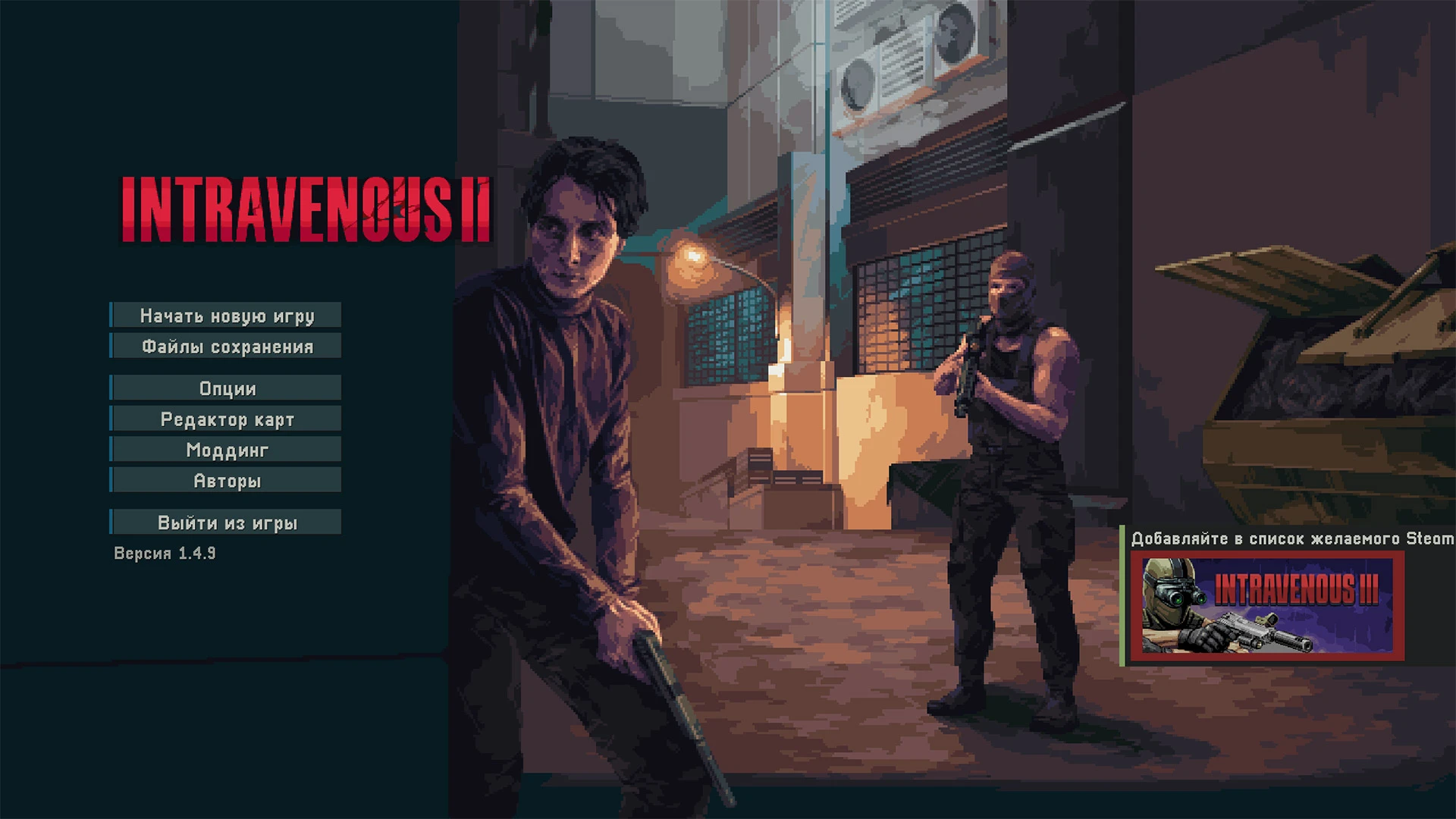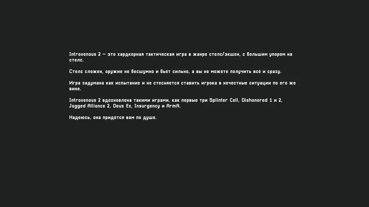 Добро пожаловать в мир Intravenous 2. Здесь вы возьмете на себя роль Шона и Стива - необычного дуэта с единой миссией: спасти свои жизни, разобравшись с противниками. Ваши решения определят ваш путь в этом мире олдскульных стелс экшнов, жестких тактических перестрелок и динамичного повествования.