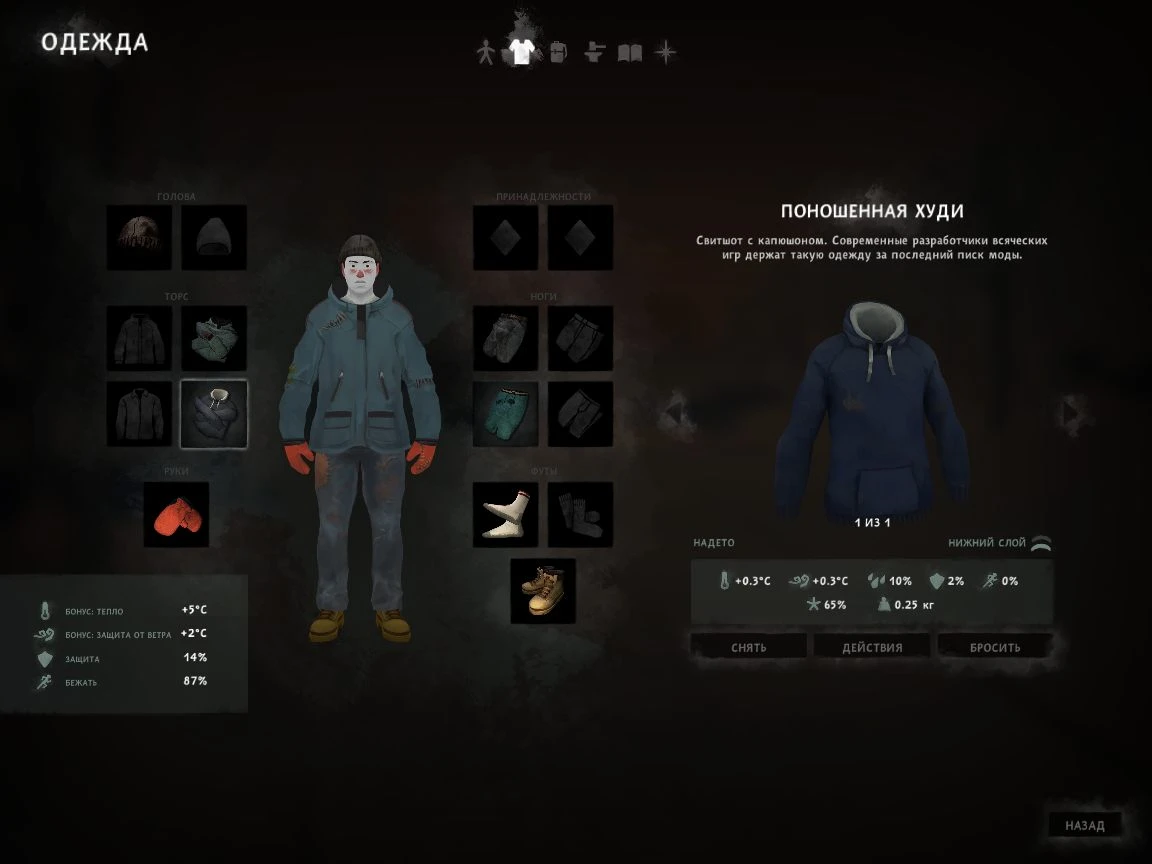 СОСТОЯНИЕ ОРГАНИЗМА И КАЛОРИИ: Следите за голодом, жаждой и температурой, пытаясь найти баланс между поиском ресурсов и затрачиваемыми на это силами. Каждое действие расходует калории, а время – ваш самый ценный ресурс. Думайте, прежде чем что-то предпринять.