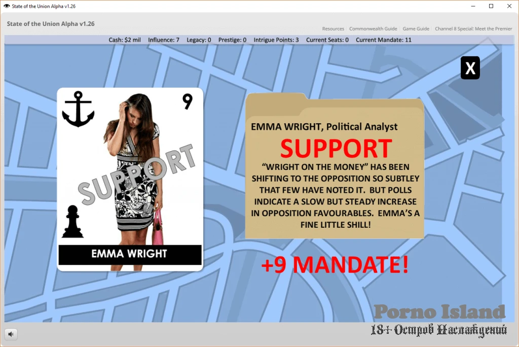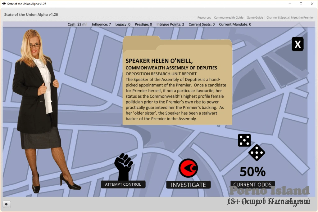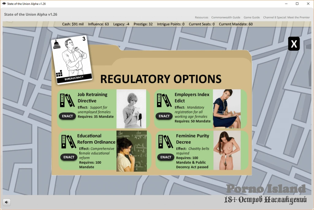 State of the Union is an adult political strategy game where the stakes couldn’t be higher! Lead a conspiracy to overthrow a feminist leader and assume control over both allies, power blocs, political parties, and key institutions.