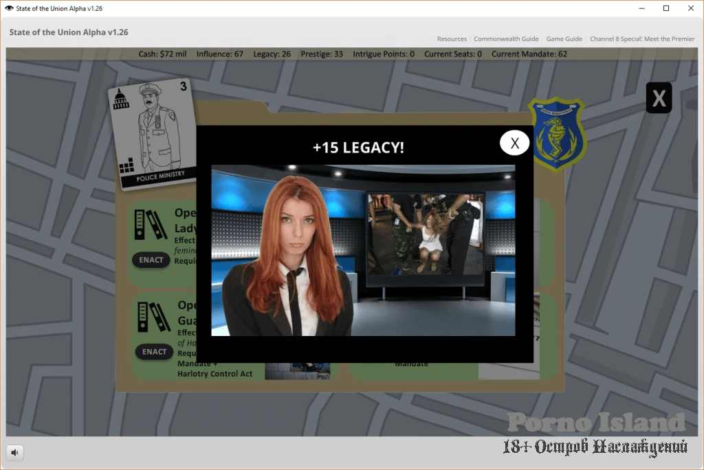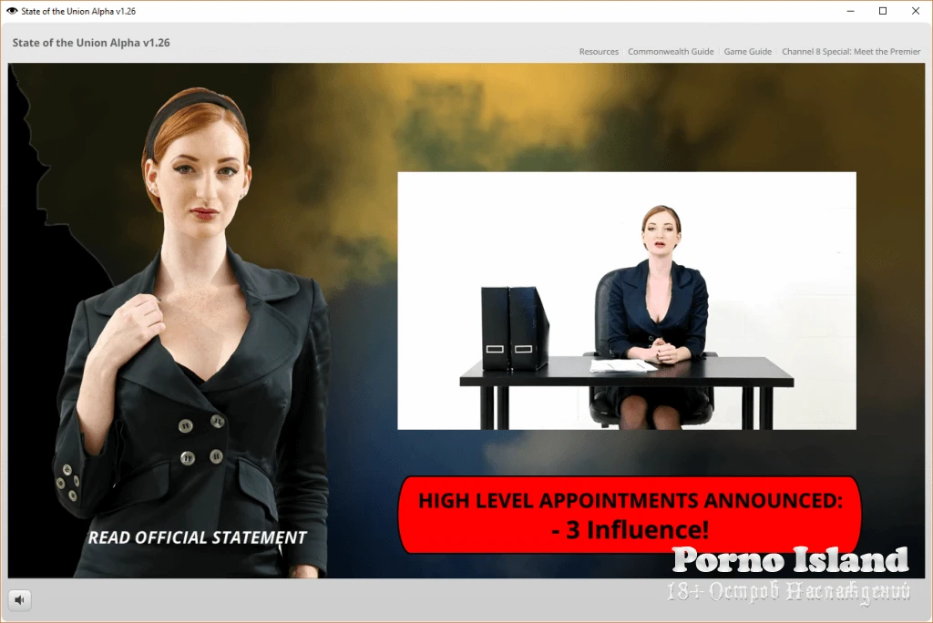 "State of the Union" - это политическая стратегия для взрослых, в которой ставки выше некуда! Возглавьте заговор с целью свержения лидера феминисток и возьмите под свой контроль обоих союзников, властные блоки, политические партии и ключевые институты. Контролируйте и направляйте самых привлекательных женщин страны, чтобы они выполняли ваши приказы и продвигали ваше дело! Измените законы, политику и нормативные акты, чтобы создать общество, которое вы предпочитаете – общество, в котором лидер-феминистка невозможен. Добейтесь успеха, и вы поставите премьер–министра на колени – в буквальном смысле этого слова - когда решите, заслуживает ли она места в вашем личном гареме.