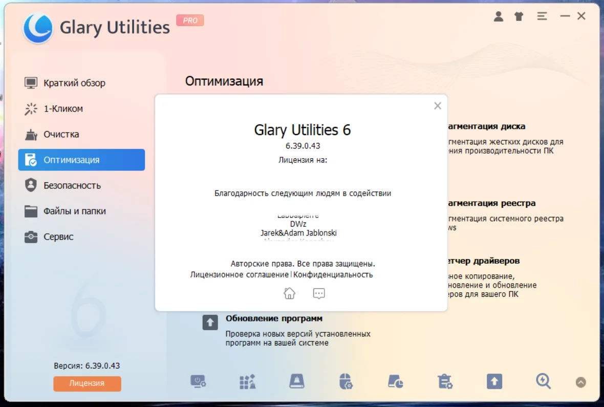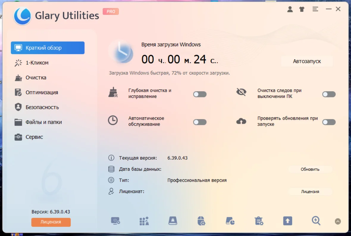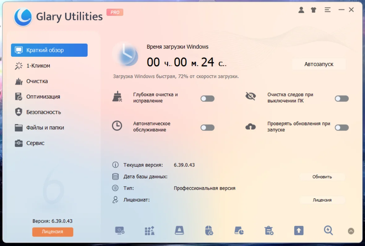 Описание: Glary Utilities - функциональный набор системных твикеров и утилит, для тонкой настройки, повышения общего уровня производительности и защиты ПК. Данное приложение позволяет пользователю избавиться от ненужных файлов, от устаревших регистрационных записей и истории интернет-активности, посредством установки различных плагинов, можно добиться полной совместимости данного приложения с более чем 45 различным программами. Более того, Glary Utilities оптимизирует процесс использования системной памяти, осуществляет поиск, а также исправление или удаление неработающих ярлыков, редактирование списка программ, загружающихся вместе с операционной системой, и удаление указанных приложений. Имеет поддержку многоязычный пользовательский интерфейс, включая поддержку русского языка. Версия программы: 6.39.0.43 Официальный сайт: Glarysoft Официальный сайт сборщика:LRepacks Язык интерфейса: Русский, Английский и другие Лечение: Не требуется (инсталлятор уже пролечен) Системные требования: