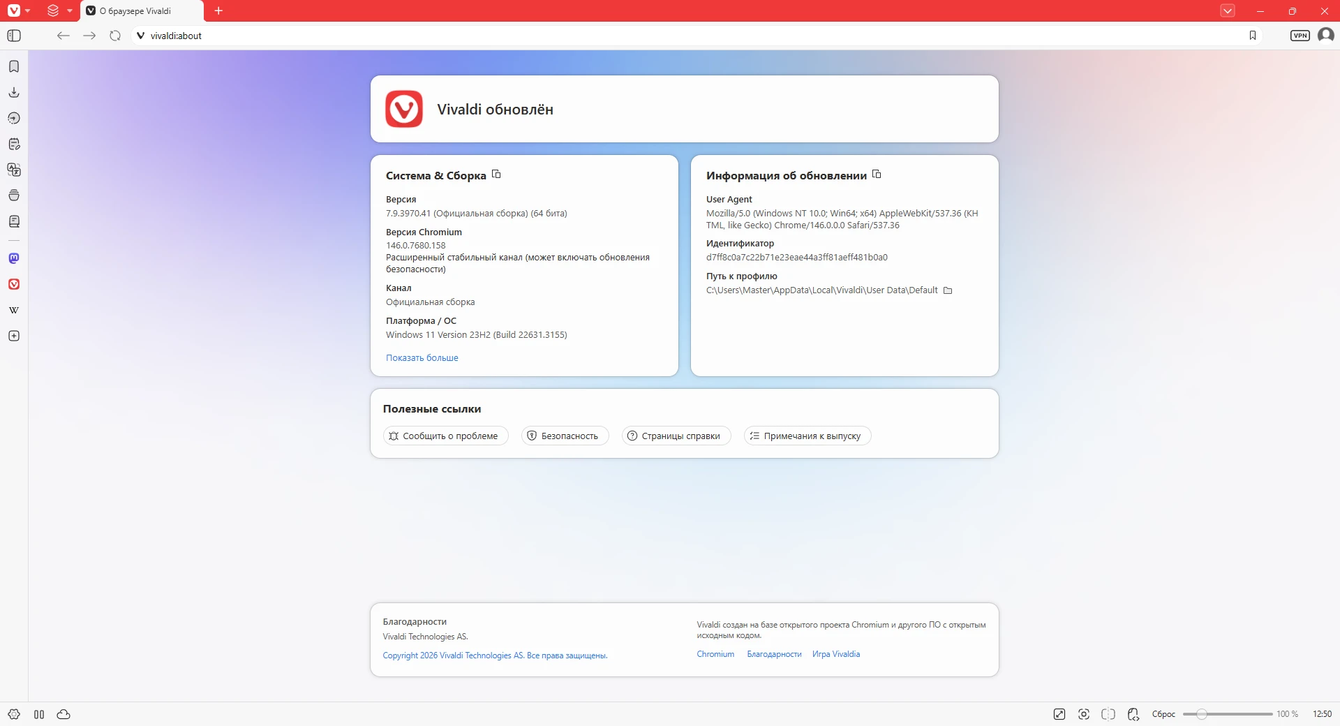 Интернет-браузер, созданный компанией Vivaldi Technologies на основе свободного браузера Chromium и движка Blink. Ряд функций, такие как боковая панель, режим отображения картинок на веб-странице, заметки, визуальные вкладки, корзина с закрытыми вкладками и многие другие были перенесены из последней версии браузера Opera 12, сделанного на движке Presto. Версия программы: 7.9.3970.39 Официальный сайт: ссылка Язык интерфейса: Русский, Английский. Лечение: не требуется Системные требования: Windows 10 — Windows 11 (x86 / x64)
